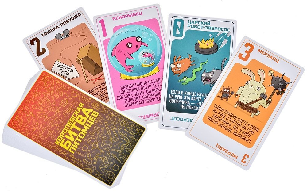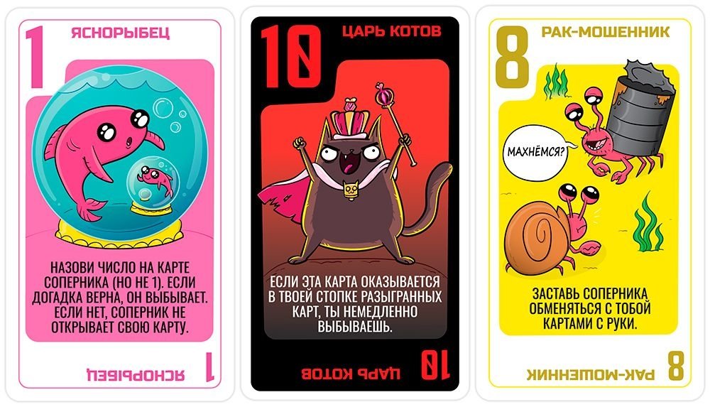 - Чем больше число, тем сильнее карта. Каждый получает по карте, а потом в свой ход берёт ещё одну и решает: какую из двух карт оставить, а какую использовать против соперников