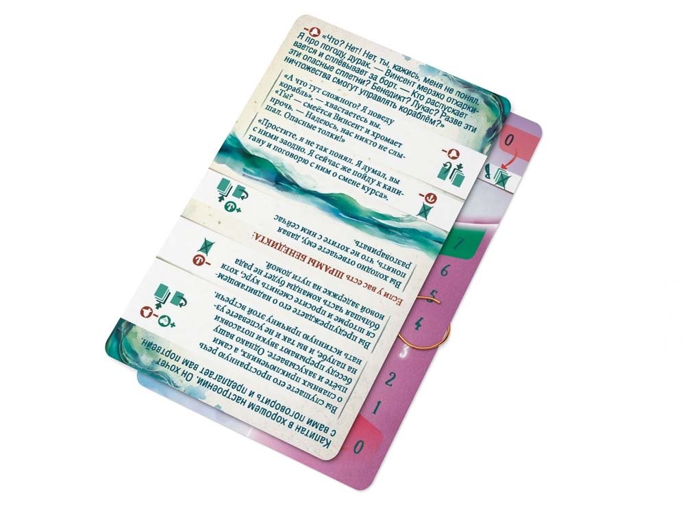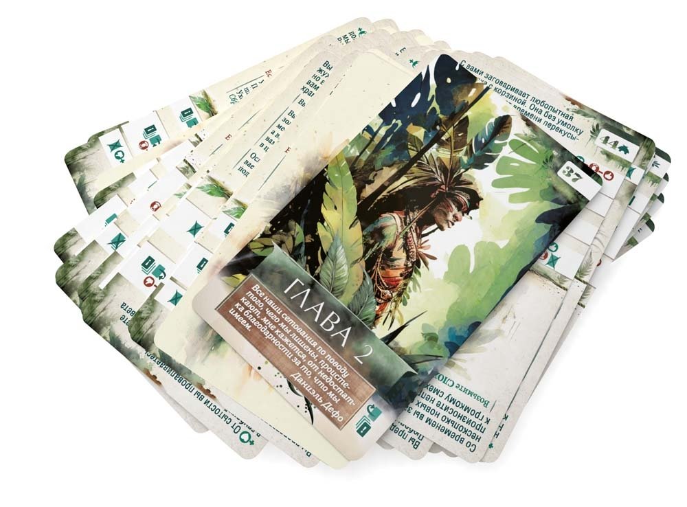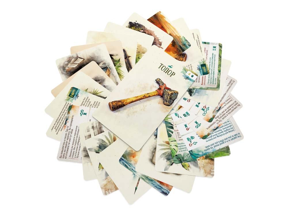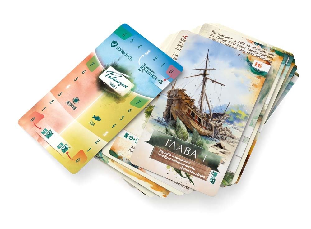 В состав настольной игры Повороты судьбы. Робинзон входит: 68 больших карт, 3 маркера-скрепки, буклет с инструкциями.