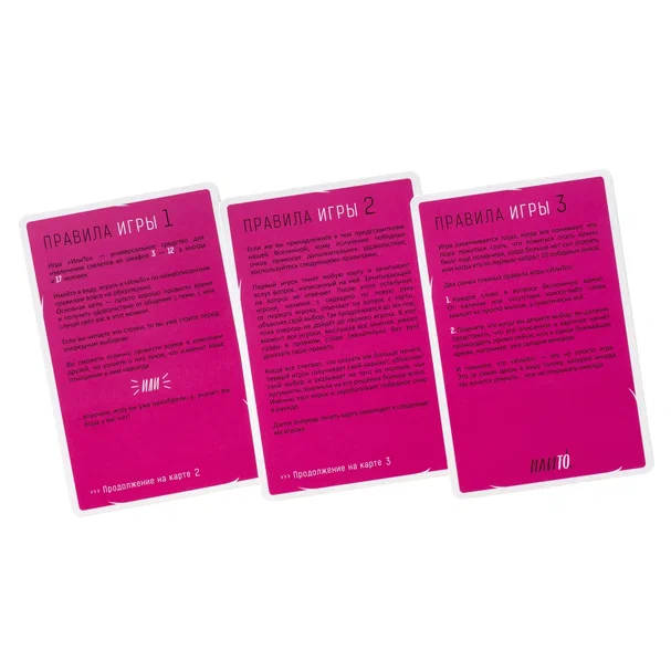 Партия в ИлиТо может длиться 10 минут или несколько часов, приятно разогреть вас перед чем-то более активным или стать ярким завершением вечера — выбор, как всегда, за вами. А ещё для этой настолки даже стол не нужен! Играйте, где захотите, совмещайте с другими развлечениями и — самое главное — получайте удовольствие. Конечно, в располагающей к откровениям компании, в которой все старше 18 лет.