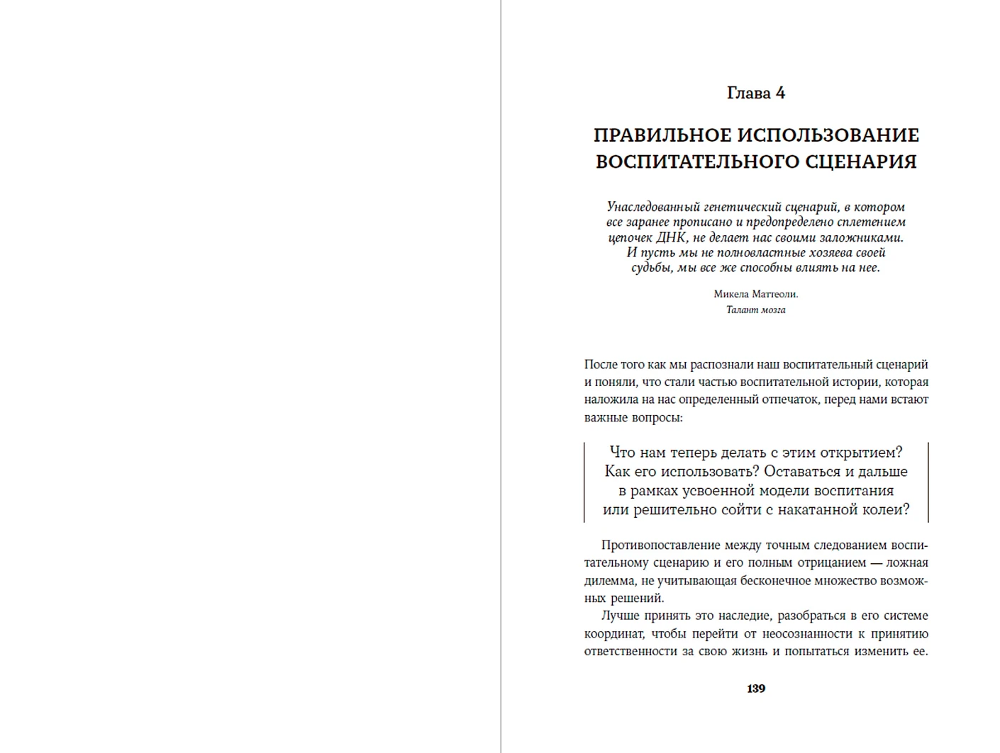 Даниэле Новара исследует феномен бессознательного копирования родительских моделей поведения и предлагает практические инструменты для осознанного выбора собственного пути. Он анализирует различные типы семейных сценариев: от гиперопеки до эмоциональной недоступности, от авторитарного воспитания до попустительства. Автор объясняет, как эти сценарии влияют на формирование личности, самооценку и межличностные отношения.