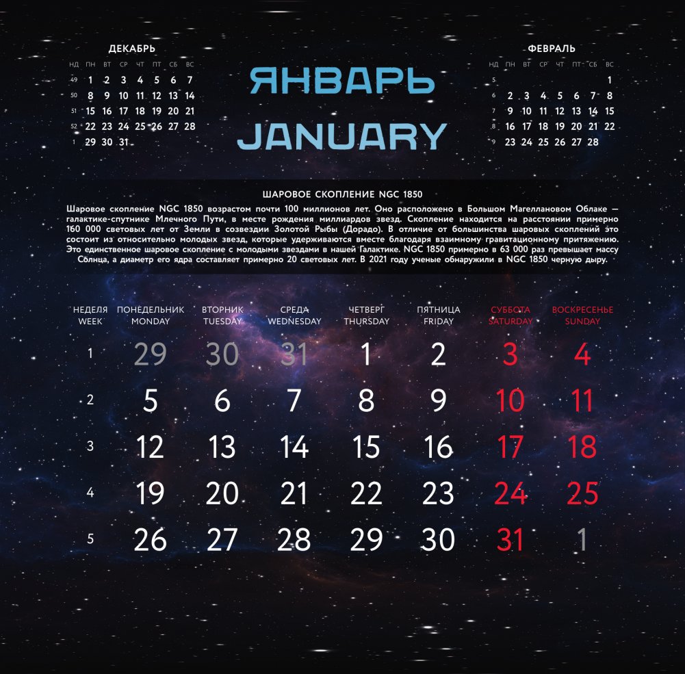 В этом календаре представлены подлинные фотографии космоса, сделанные легендарным космическим телескопом "Хаббл". Его открытия стали настоящим прорывом в астрономии — не только для ученых, но и для широкой публики. В отличие от своих предшественников, "Хаббл" сделал космос ближе, понятнее и увлекательнее для людей всех возрастов. Его яркие и детализированные снимки стали основой для важнейших научных открытий, касающихся структуры и развития Вселенной, агалктик, туманностей, звезд, экзопланет и ближайших объектов в нашей Солничной системе. Благодаря наблюдениям "Хаббла" мы по-новому взглянули на бескрайний космос и на собственное место в нем.