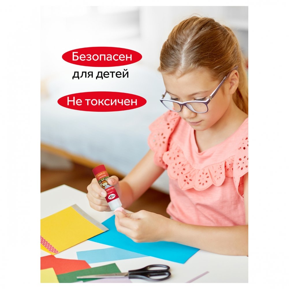 Предназначен для склеивания бумаги (в том числе и фотобумаги), картона, ткани. Не оставляет следов на одежде и легко смывается водой. Клей производится на основе натуральных ингредиентов, не содержит растворителей, поэтому безопасен для детей. Круглый корпус удобно держать в детской руке.