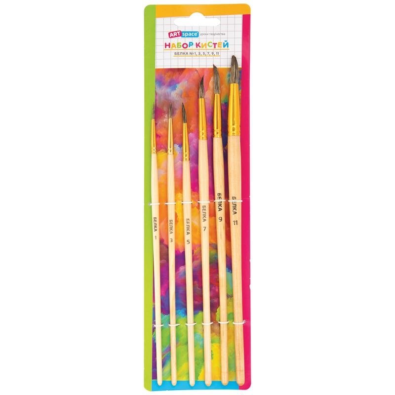 Набор кистей ArtSpace 6шт., белка, круглые, № 1, 3, 5, 7, 9, 11, блистер