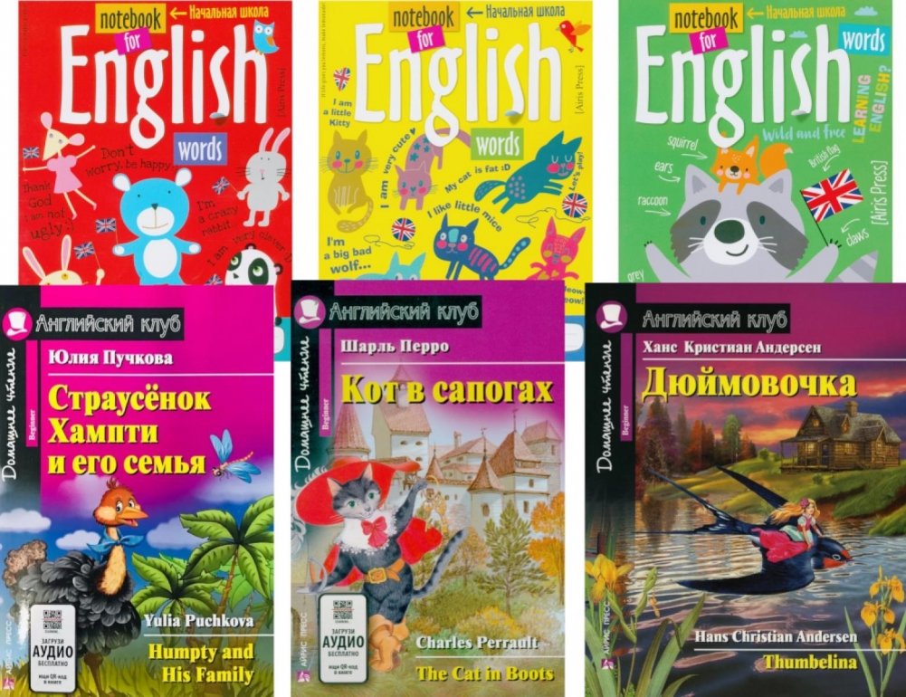 Страусенок Хампти и его семья. Кот в сапогах. Дюймовочка + Тетради для записи английских слов.(комплект из 3-х книг + 3 тетради). Книги на англ.языке