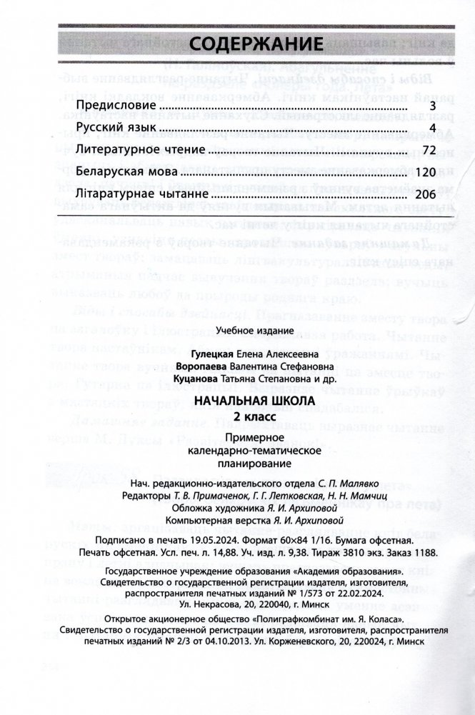 Начальная школа. Русский язык. Литературное чтение. Беларуская мова. Літаратурнае чытанне. 2 класс. Примерное календарно-тематическое планирование. 2025/2026 учебный год
