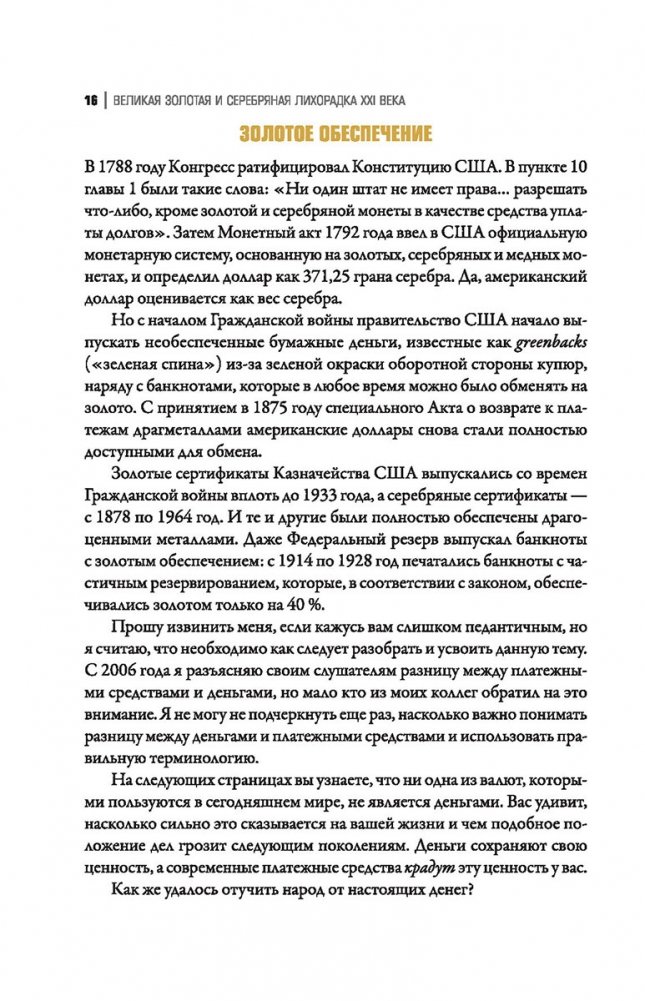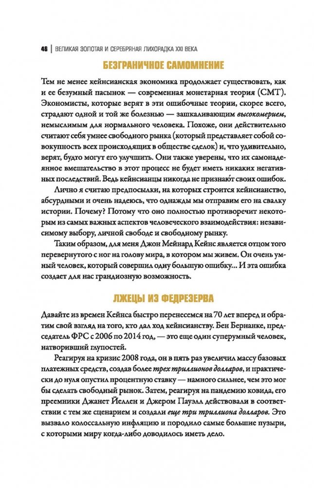 Книга рассказывает о неизбежности событий, которые нас ожидают, об их невероятных масштабах и о том, как вы можете извлечь из них выгоду. Ведь силы, угрожающие мировой валютной системе, — это те же самые силы, которые поднимут золото и серебро на недосягаемую высоту.