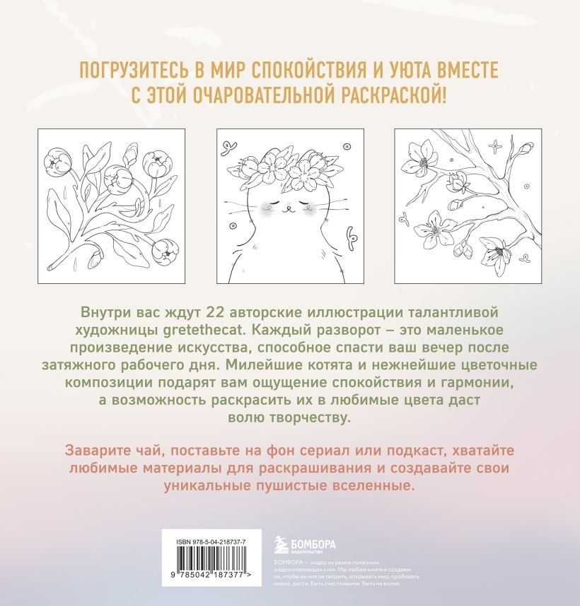 Откройте для себя пушистые вселенные с этой раскраской. Внутри читателя ожидают 22 авторские иллюстрации художницы gretethecat, где пушистые котята живут среди цветочных грёз. Каждая страница — словно тихий вечер после долгого дня, наполненный теплом, нежностью и уютом. Заварите чай, поставьте на фон сериал или подкаст, хватайте любимые материалы для раскрашивания и создайте свои уникальные пушистые вселенные.
