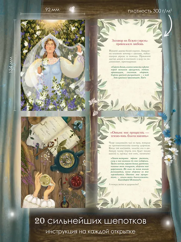 Набор из 20 открыток с шепотками и заговорами на любовь, деньги и удачу. На одной стороне — иллюстрация для конкретного шепотка, с другой — инструкция по чтению и сам магический текст.