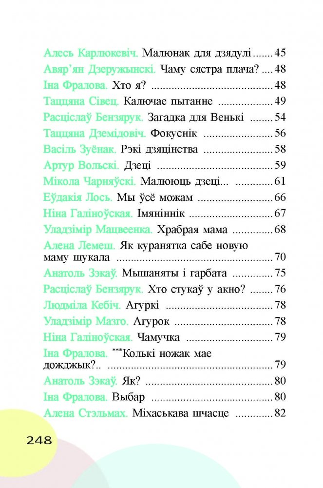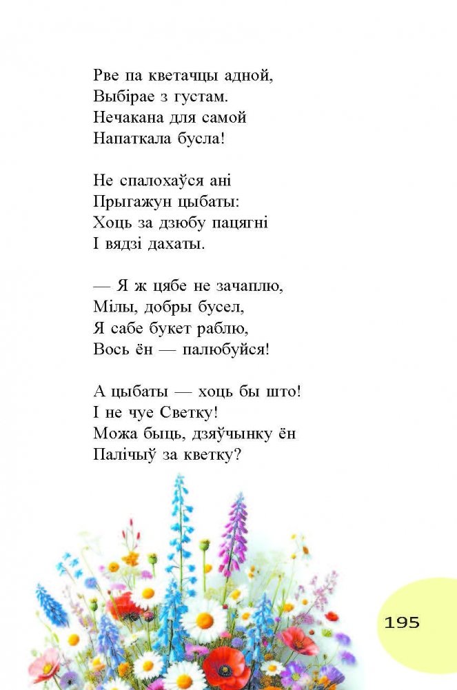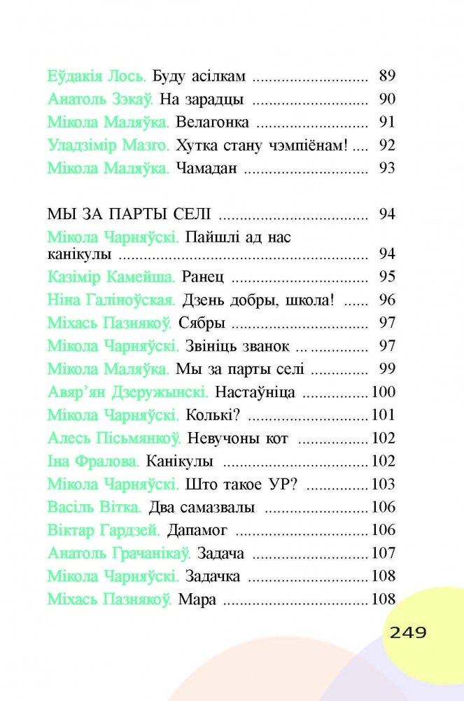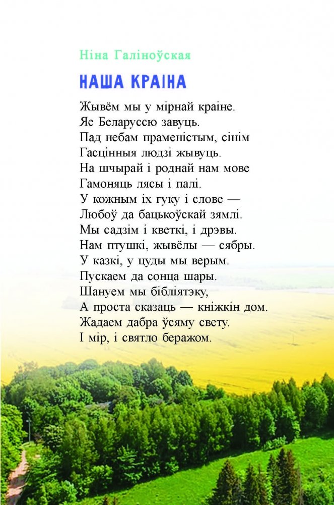У кнігу ўвайшлі дзіцячыя вершы і апавяданні на роднай мове. Чытанка складаецца з сямі тэматычных раздзелаў, дзе распавядаецца пра сям'ю, сяброўства, добрыя паводзіны, пра з'явы прыроды, школу і кнігу, любоў да Радзімы.
