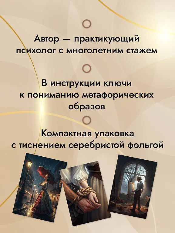 Трилогия судьбы — уникальная колода метафорических и литературных карт, вдохновленная известными романами Л. Н. Толстого "Война и мир", "Анна Каренина" и "Воскресение". Эти карты станут вашим надежным инструментом для самопознания, личностного роста и работы с внутренними конфликтами. Колода составлена практикующим психологом с многолетним стажем. Колода состоит из 56 карт, каждая из которых отражает архетипы личности и теневые проявления. Каждая карта колоды – это метафора, отражающая сложные человеческие чувства, мотивы и жизненные сценарии. Для большего погружения на каждой карте находится цитата, которая поможет найти ответы на вопросы и по-новому взглянуть на знакомые романы. Подарите себе или своим близким возможность заглянуть вглубь себя и открыть новые смыслы в произведениях классика.