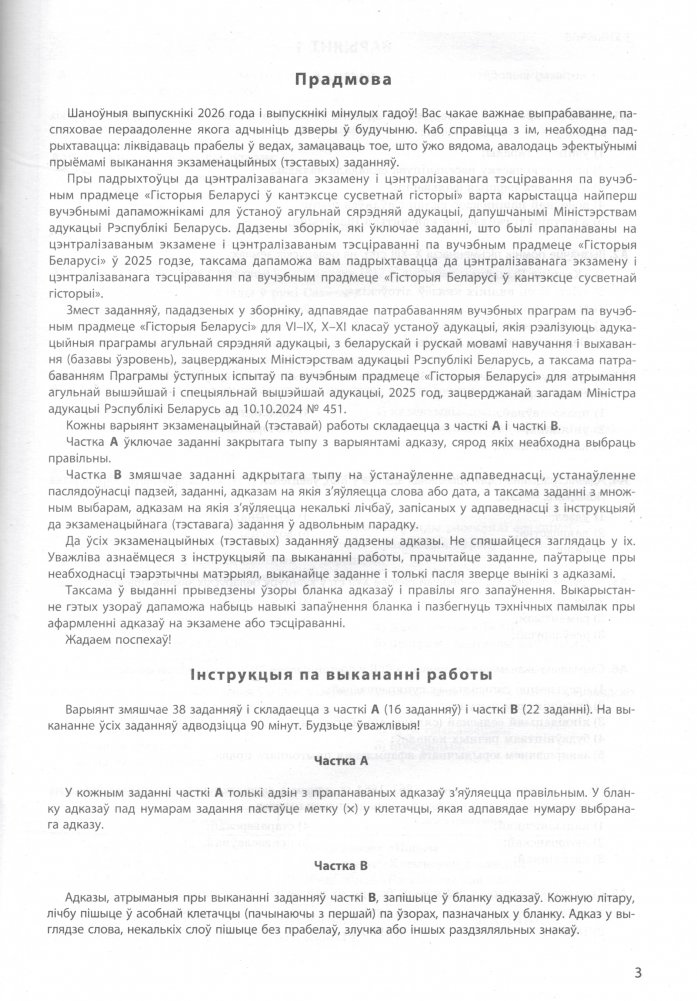 Зборнік тэстаў змяшчае экзаменацыйныя (тэставыя) заданні па гісторыі Беларусі, прапанаваныя ўдзельнікам цэнтралізаванага экзамену і цэнтралізаванага тэсціравання ў 2025 годзе. Да ўсіх заданняў пададзены адказы.