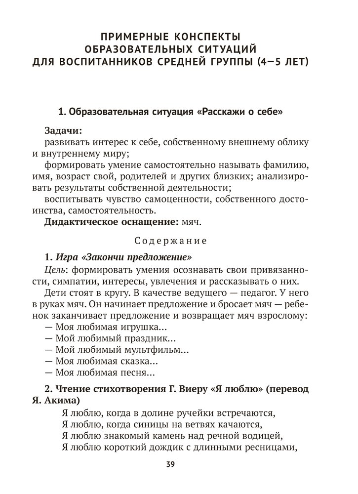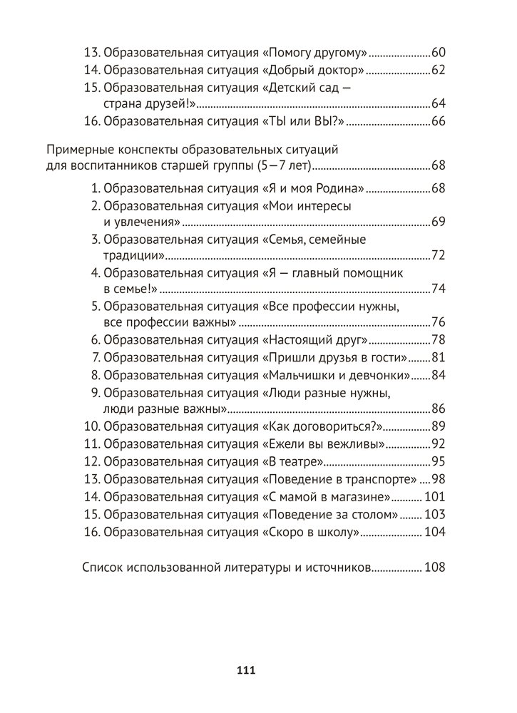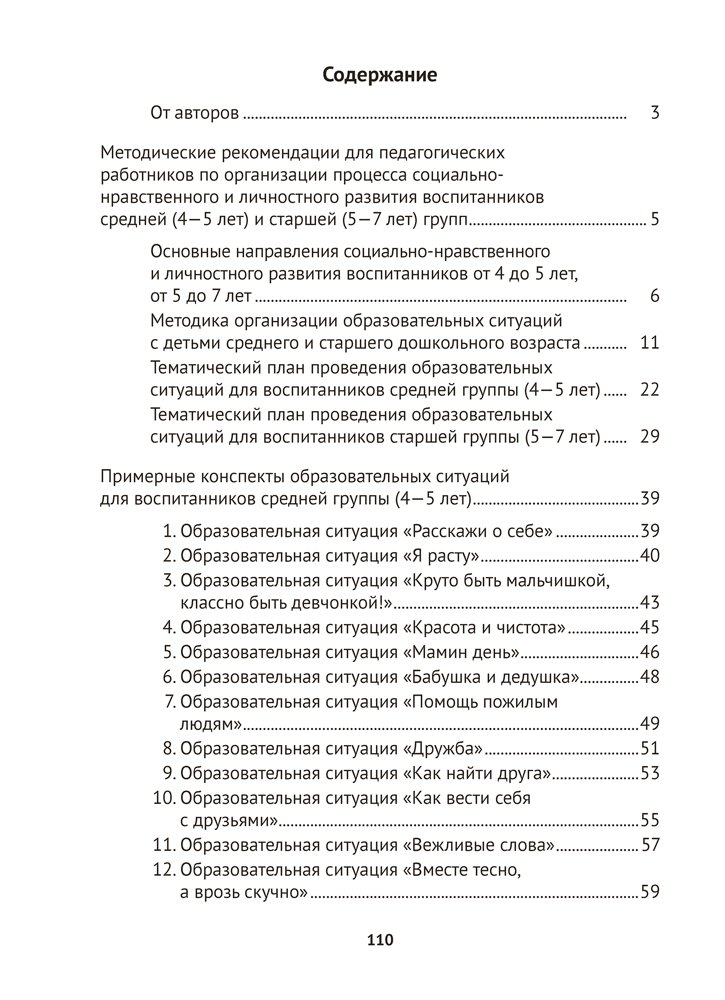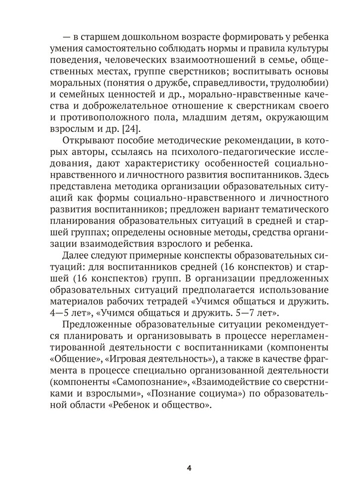 Пособие включает конспекты образовательных ситуаций, направленных на социально-нравственное и личностное развитие воспитанников средней (от 4 до 5 лет) и старшей (от 5 до 7 лет) групп. Содержание издания способствует реализации задач образовательной области «Ребенок и общество» (компоненты «Самопознание», «Взаимодействие со сверстниками и взрослыми», «Познание социума») учебной программы дошкольного образования.