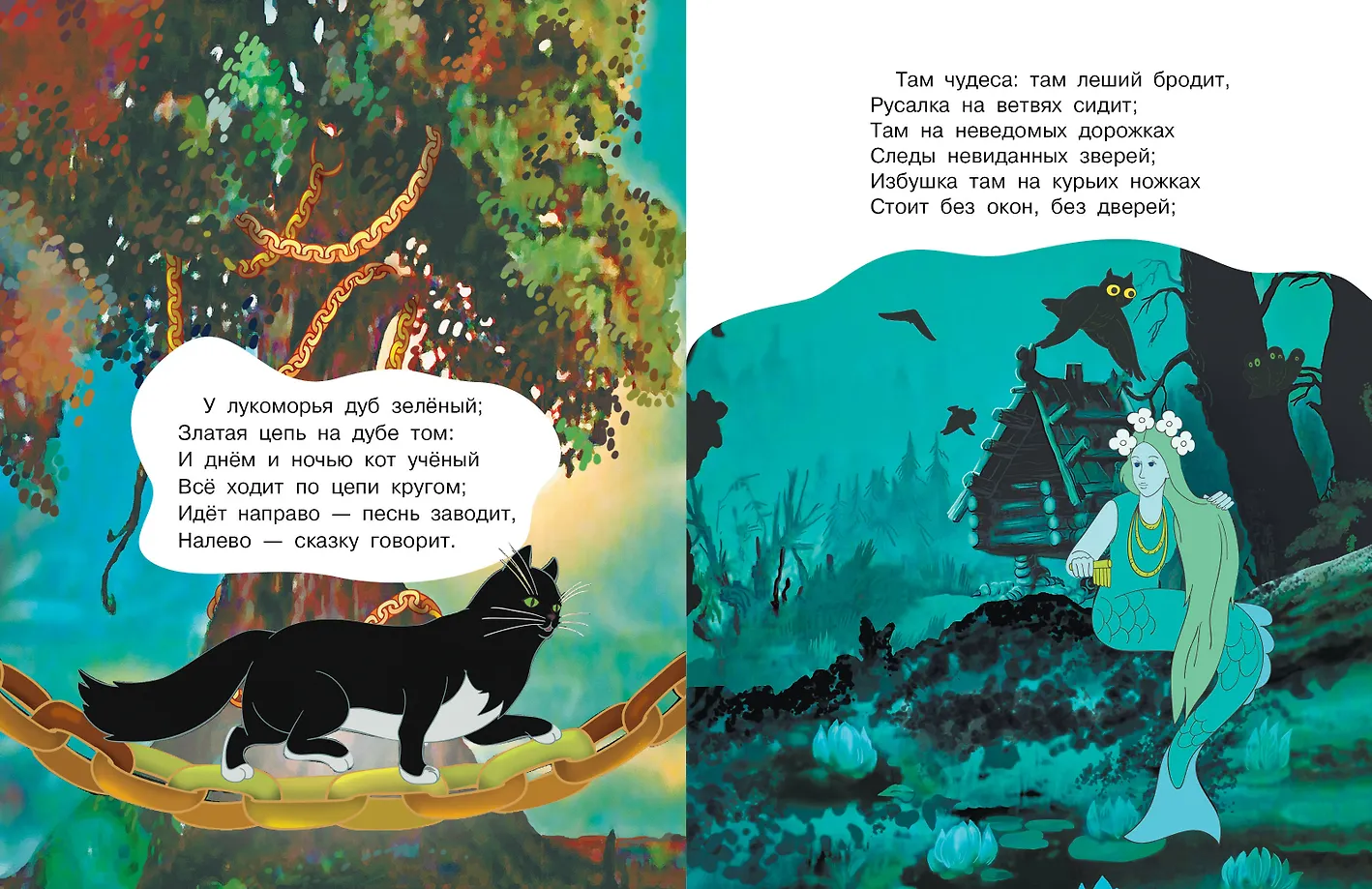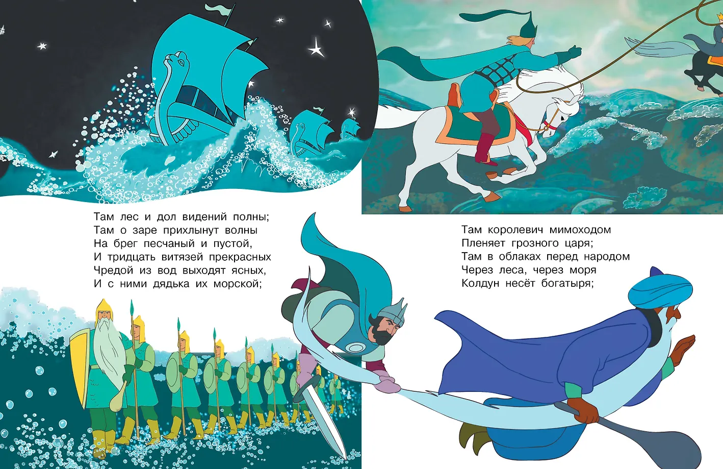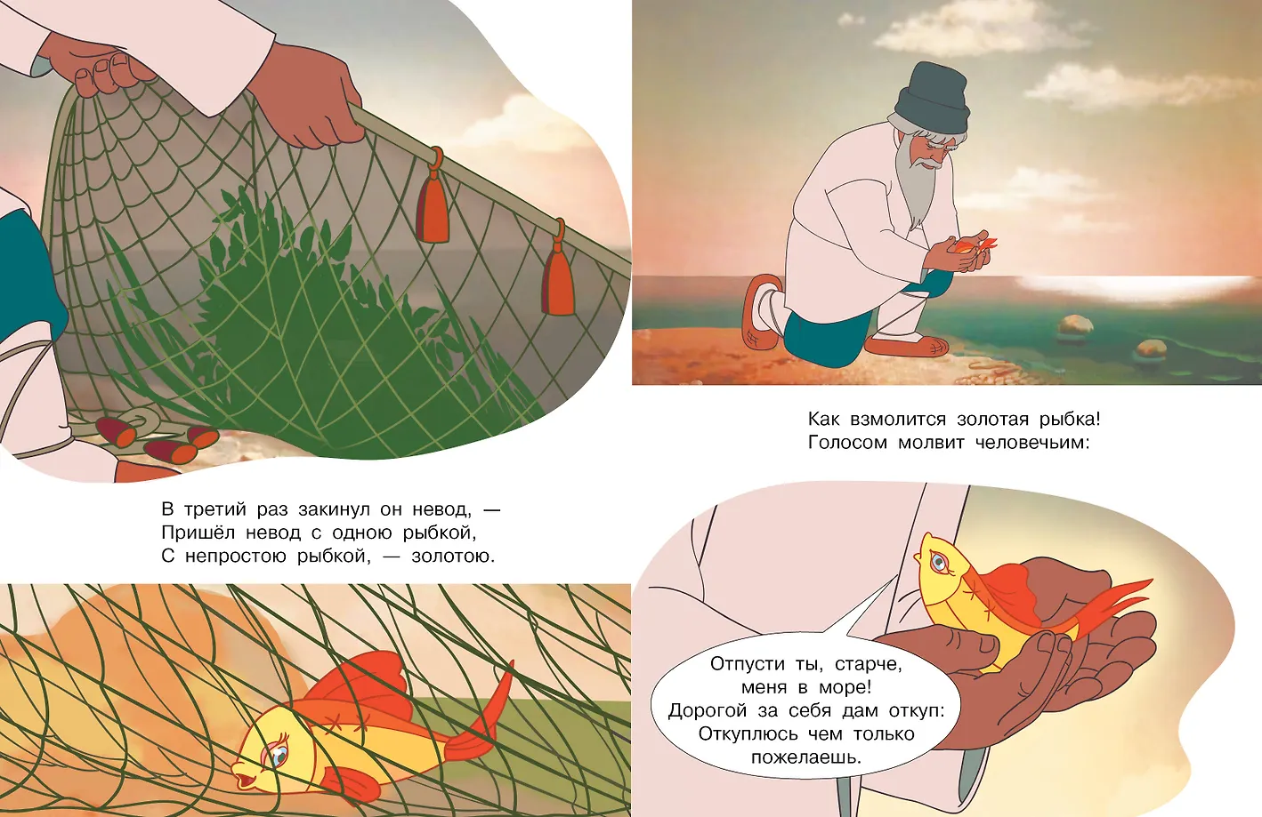 В книгу вошла знаменитая "Сказка о рыбаке и рыбке" А. С. Пушкина. Сказка о жадной старухе, добром старике и волшебной золотой рыбке входит в программы школьного чтения. Текст дан без сокращений и адаптаций. В 1950 году по "Сказке о рыбаке и рыбке" был снят одноимённый музыкальный мультфильм. А в 1951 году он получил премию "За лучший мультфильм" на Международном фестивале. Как и наша книжка, он начинается с пролога из поэмы А. С. Пушкина "Руслан и Людмила".