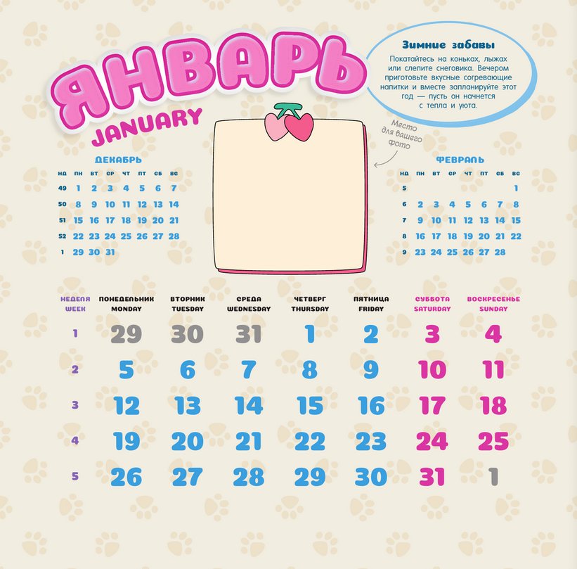 Этот настенный календарь наполнит каждый месяц 2026 года радочтью и иуютом! Вместе с милыми кошачьими семьями вы будете гулять, мастерить, играть, готовить и мечтать — ведь в каждом месяце вас ждет простая и душевная идея для совместного досуга. Не забывайте фотографировать ваши семейные приключения и фиксировать их в специальном месте для каждого месяца. В конце года вы сможете пересмотреть теплые кадры и создать фотоальбом воспоминаний. А на последних страницах представлен календарь на 2027 год с местом для заметок и планов — чтобы мечты продолжали сбываться и дальше. Пусть каждый месяц будет особенным!