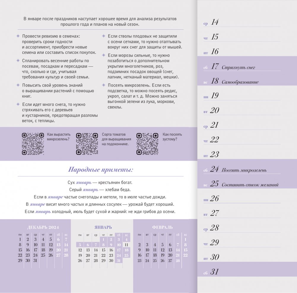Посеешь в погоду — больше приплоду. Этот календарь поможет вам поймать нужный момент! В каждом месяце — список дел от Алены Волковои, автора блога "Аленин сад", и народные приметы, которые помогут скорректировать время посадок в зависимости от погодных условий. QR-коды откроют доступ к полезным видео, где все показано наглядно и по депу. Работайте в ритме природы — с подсказками под рукой!