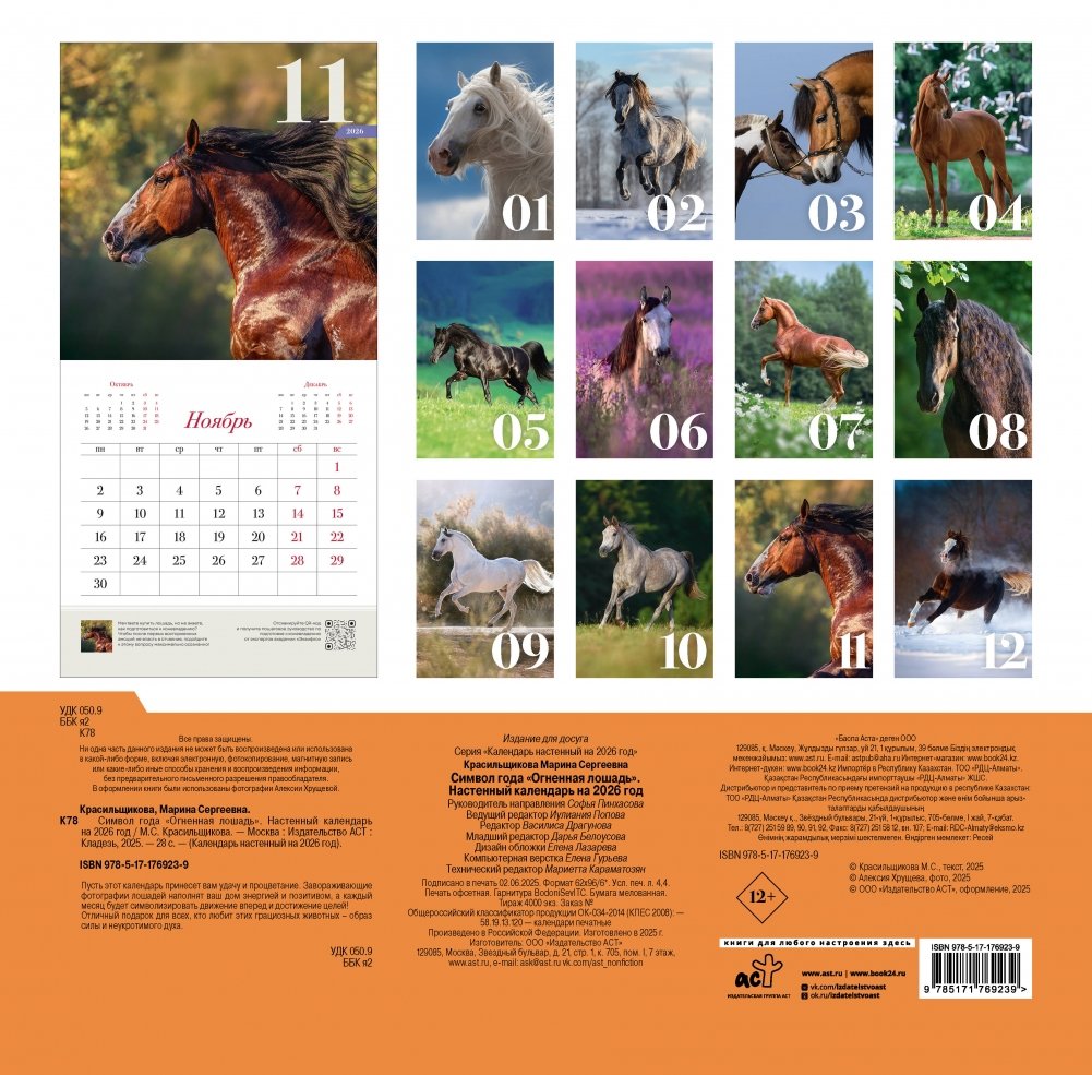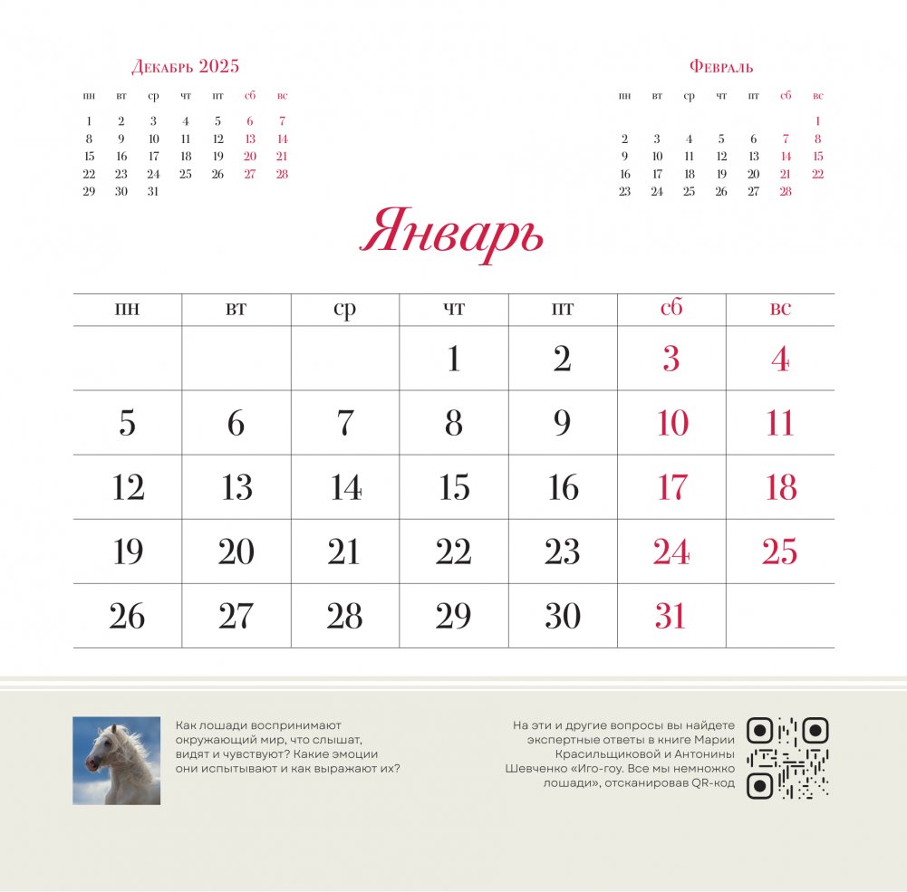 Символ 2026 года — огненная лошадь! Пусть этот календарь принесет вам удачу и процветание. Завораживающие фотографии лошадей наполнят ваш дом энергией и позитивом, а каждый месяц будет символизировать движение вперед и достижение целей! Отличный подарок для всех, кто любит этих грациозных животных – образ силы и неукротимого духа.