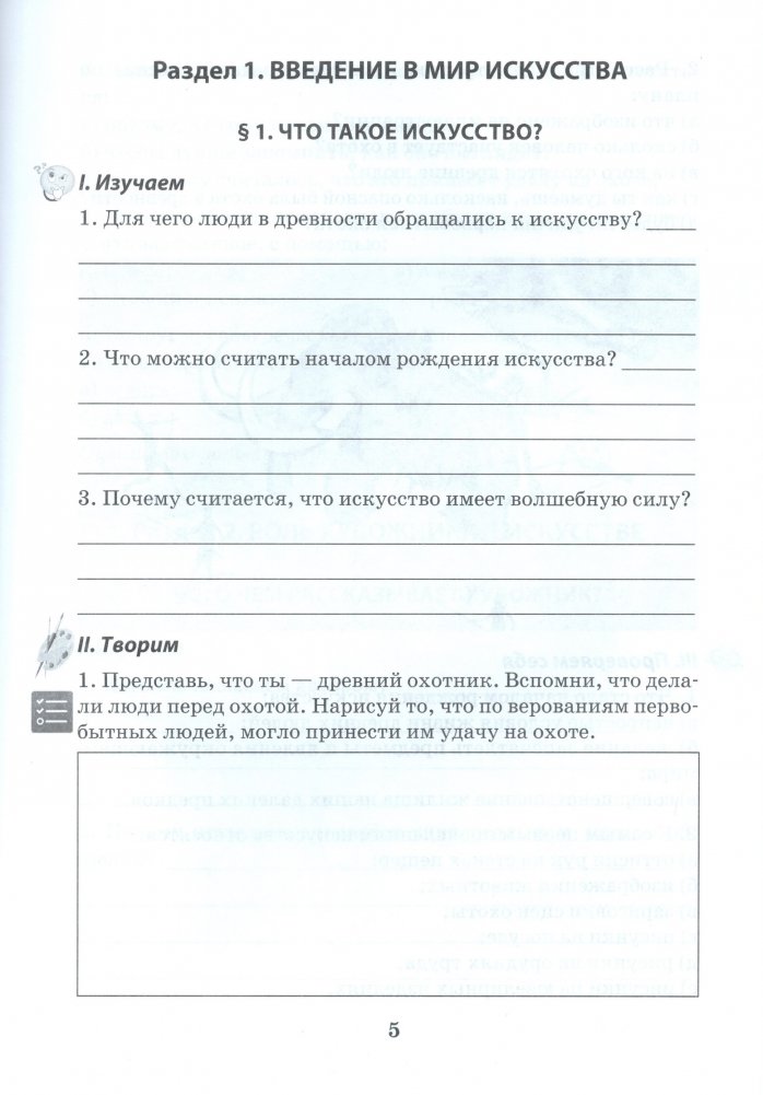 Пособие представлеяет собой раздаточные материалы для работы на уроках по учебному предмету "Искусство (отечественная и мировая художественная культура)" и включает практические и творческие задания по учебному материалу для 5-го класса. Их содержание соответствует учебной программе и пособию по предмету и позволяет сформировать у учащихся умения и навыки, необходимые для изучения искусства.