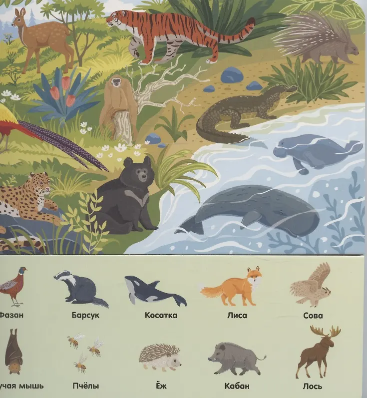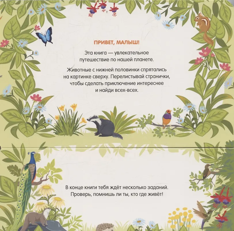 Эта книга разделена на две половины: в нижней указаны все животные, которых нужно найти на верхней картинке. Книга тренирует концентрацию внимания, усидчивость, память расширяет кругозор. Плотный картон удобен для самых маленьких читателей, а скругленные углы страниц книги не повредят маленькие пальчики.