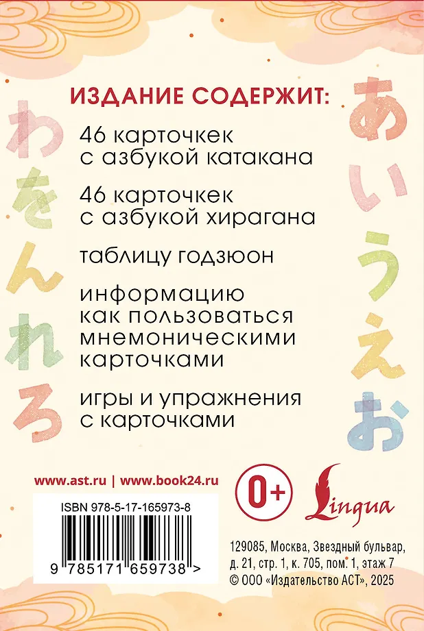 Набор карточек для изучения хираганы и катаканы — простой и наглядный способ освоить японскую письменность. В коробке собраны все основные слоги обеих азбук. Каждая карточка включает слог на японском, русскую подсказку для чтения, примеры слов с этим слогом, а также схему написания с порядком черт.