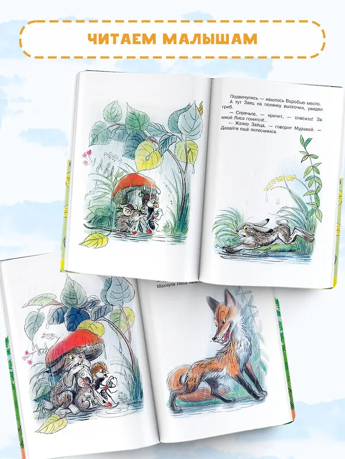 В книгу вошла сказка "Под грибом" знаменитого художника-сказочника В. Сутеева. Как-то раз застал Муравья сильный дождь. И спрятался он под маленьким грибком. Не успел дождь пройти, а под шляпкой гриба оказалась целая компания зверят — и Бабочка, и Мышка, и Воробей, и даже Заяц! Как все они поместились под грибом? Для детей до 3-х лет.