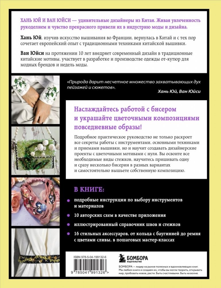 Откройте для себя искусство вышивки бисером с выдающимися китайскими дизайнерами Хань Юй и Ван Юйси! Под их чутким руководством вы научитесь сочетать традиционные техники и современные дизайнерские подходы, создавая стильные аксессуары с цветочными мотивами. Подробно описанные приемы вышивки и справочник стежков будут полезны как новичкам, так и опытным вышивальщицам. А пошаговые мастер-классы и понятные схемы помогут воплотить в жизнь самые смелые идеи. Украшайте повседневные аксессуары изысканными цветами, используя авторские дизайны и придумывая собственные!