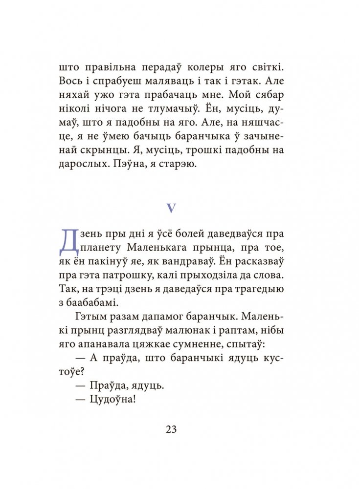 «Маленькі прынц» — філасофская казка, у якой чытач любога ўзросту знойдзе тое, што адгукаецца яго душы. Яна выйшла ў 1943 годзе ў Нью-Ёрку і з таго часу была перакладзена больш чым на 250 моў і выдадзена мільёнамі экзэмпляраў па ўсім свеце. На беларускай мове пабачыла свет у 1989 годзе ў перакладзе Ніны Мацяш. Пазней перакладчыца дапрацоўвала і рэдагавала тэкст, і ў гэтым выданні казка ўпершыню друкуецца з яе праўкамі.