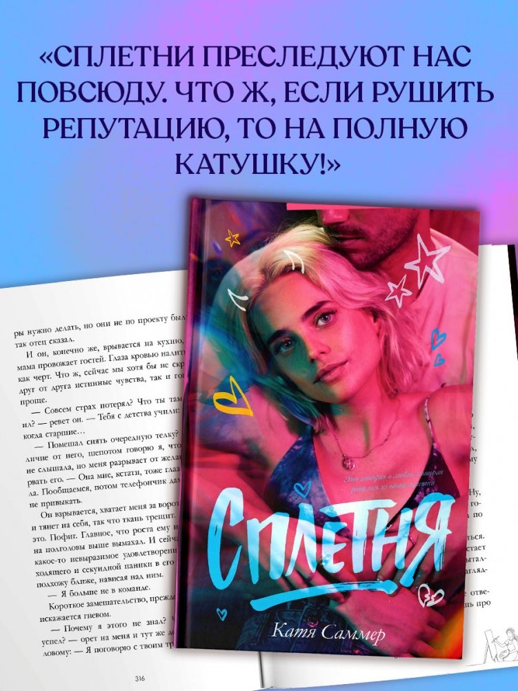 Увлекательная книга, женский роман с историей фиктивных отношений, прошедших путь «от ненависти до любви» с эмоциональной фотографией на обложке — отличный подарок и книжная радость женщине, девушке, подруге на любой праздник. Подарите книгу «Сплетня» всем, кто читает книги про любовь, любовные романы, захватывающие книги для взрослых и интересные книги Кати Саммер.