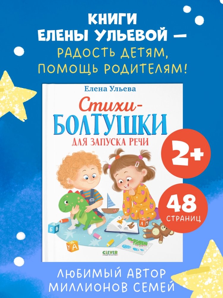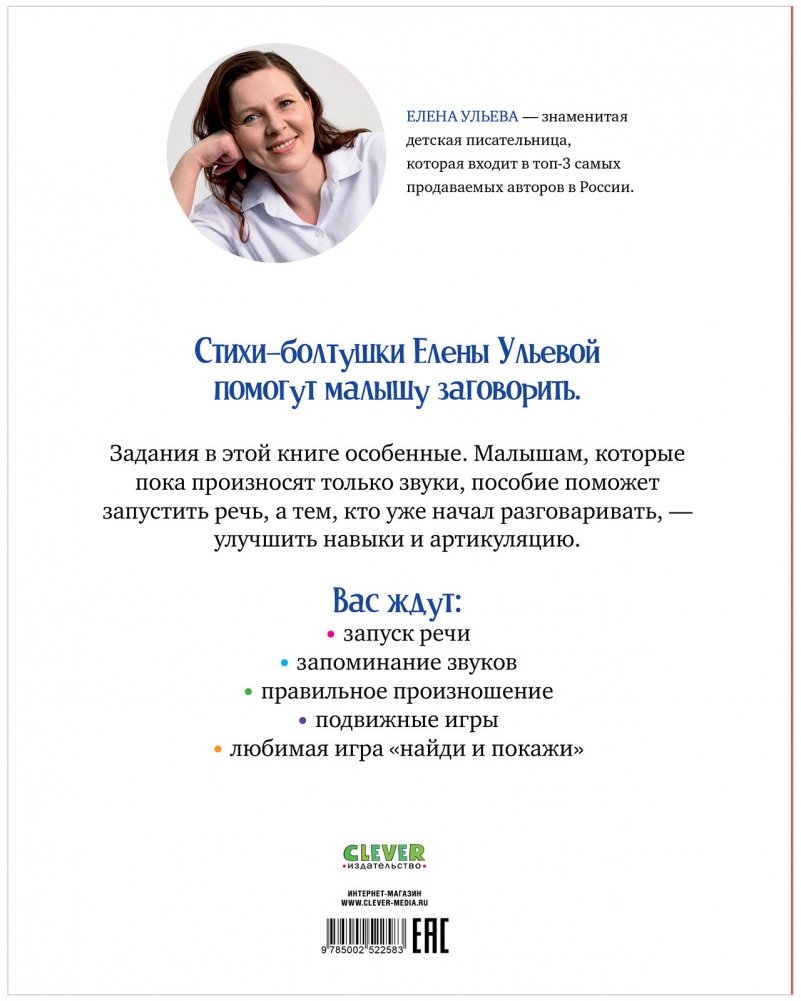 Веселые стихи-болтушки этой Clever книги помогут ребенку запомнить произношение слов, выучить слоги и даже отдельные слова, так что запуск речи пройдет легко и весело!