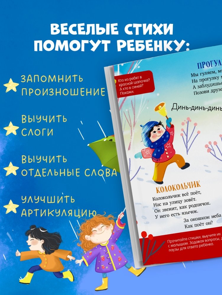 Задания книги для детей «Стихи-болтушки для запуска речи» особенные. Мальчикам и девочкам, которые пока произносят только звуки, книжка для малышей поможет запустить речь, а тем, кто уже начал разговаривать, — улучшить навыки и артикуляцию.