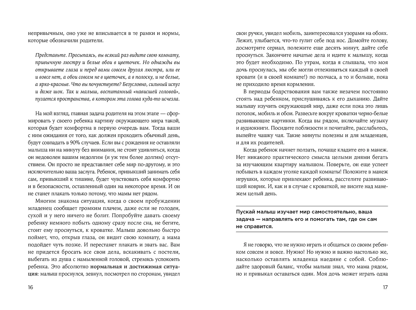 Ссылки на исследования детских психологов и педиатров, рубрики «Вопрос-ответ», чтобы быстро получить ответ на волнующие вопросы, четкая структура книги, охватывающая все аспекты жизни после появления младенца.