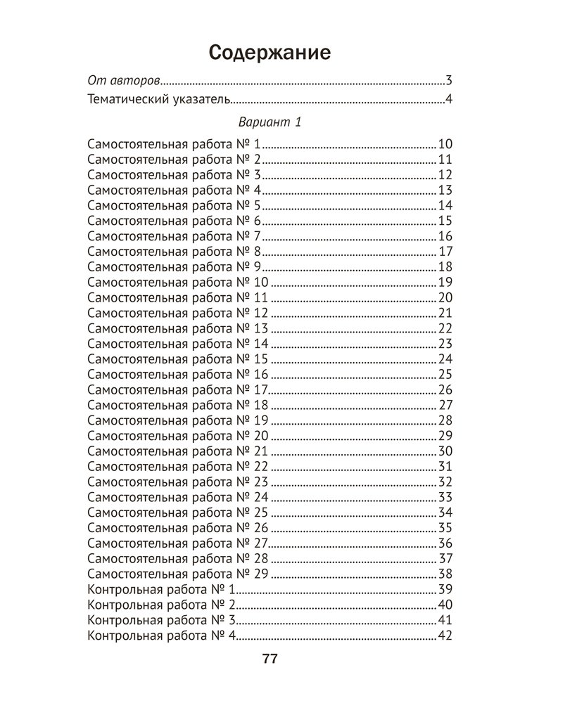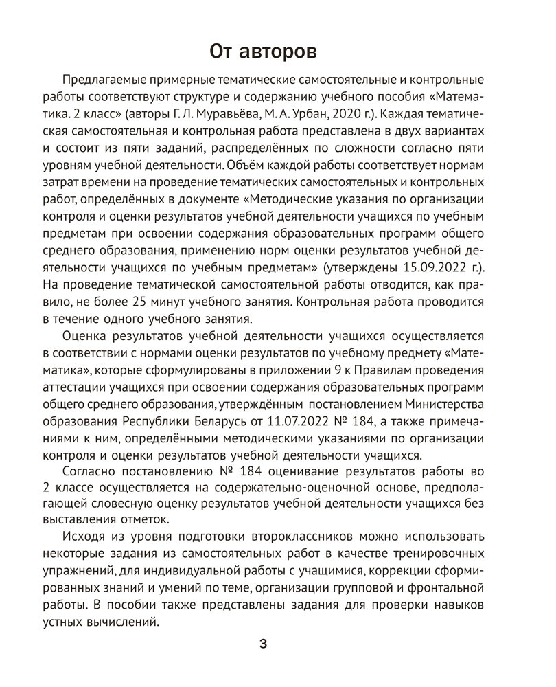 Пособие составлено в соответствии с учебной программой. Каждая самостоятельная и контрольная работа представлена в двух вариантах и соотносится с содержанием учебного пособия «Математика. 2 класс» (авторы Г. Л. Муравьёва, М. А. Урбан). В издании также размещён материал для проверки навыков устных вычислений.