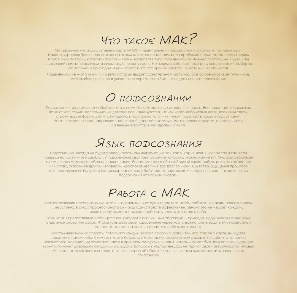 Волшебный календарь, наполненный символами и знаками для тех, кто любит получать подсказки из ярких образов и своего подсознания. В каждом месяце вы найдете необычную метафорическую иллюстрацию (карту) с текстом и вопросы на каждый день, которые помогут вам ежедневно находить новые послания во вселенной метафор. В календаре есть инструкция, которая расскажет о магии метафорических карт и о том, как с ними взаимодействовать.