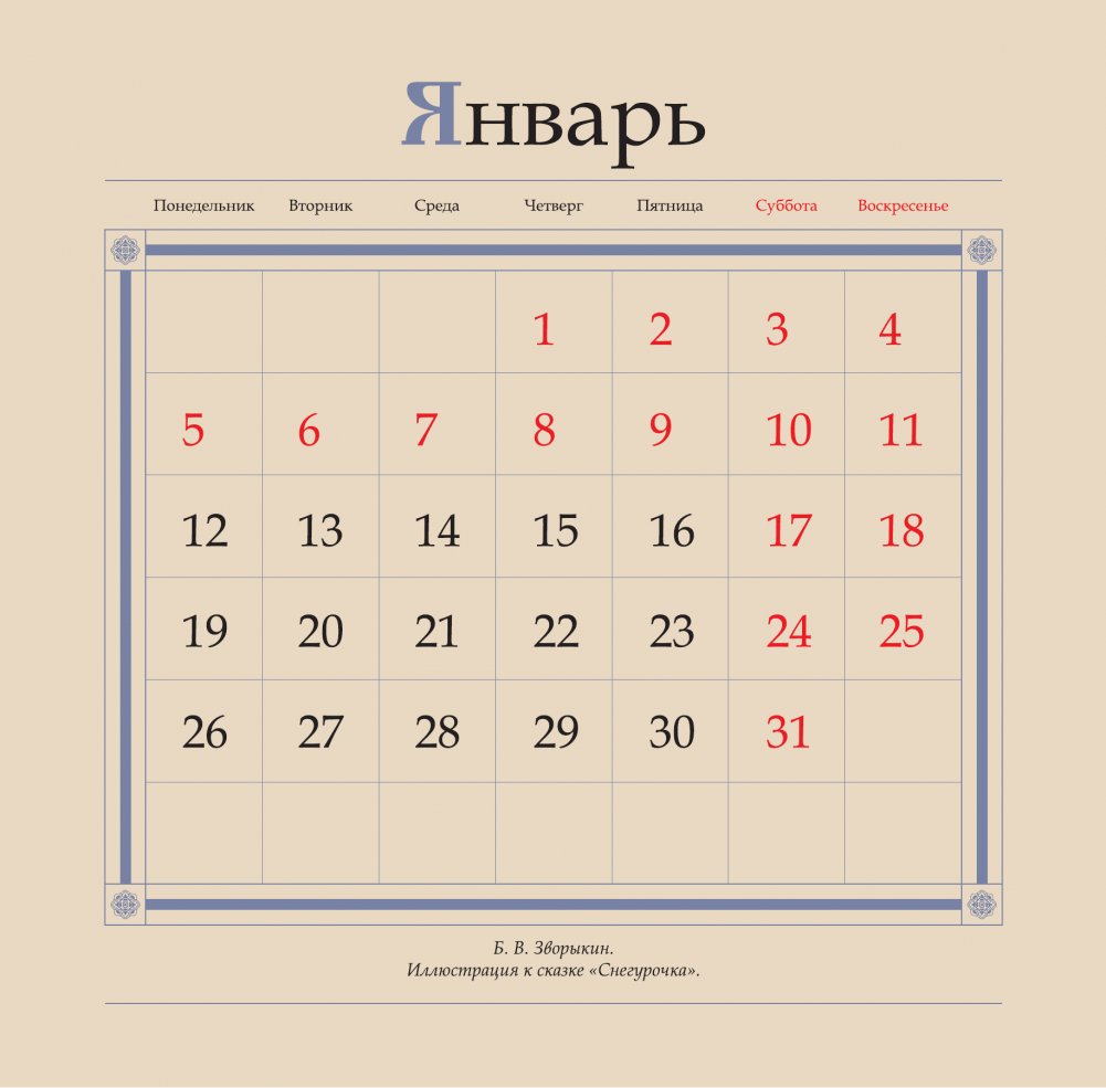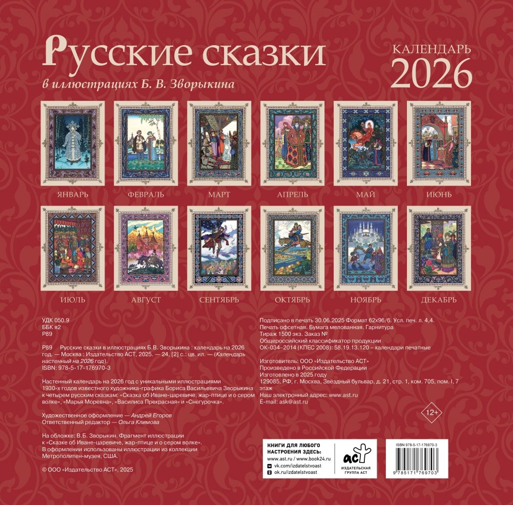 Настенный календарь на 2026 год с уникальными иллюстрациями 1930-х годов известного художника-графика Бориса Васильевича Зворыкина к четырем русским сказкам: "Сказка об Иване-царевиче, жар-птице и о сером волке", "Марья Моревна", "Василиса Прекрасная" и "Снегурочка".