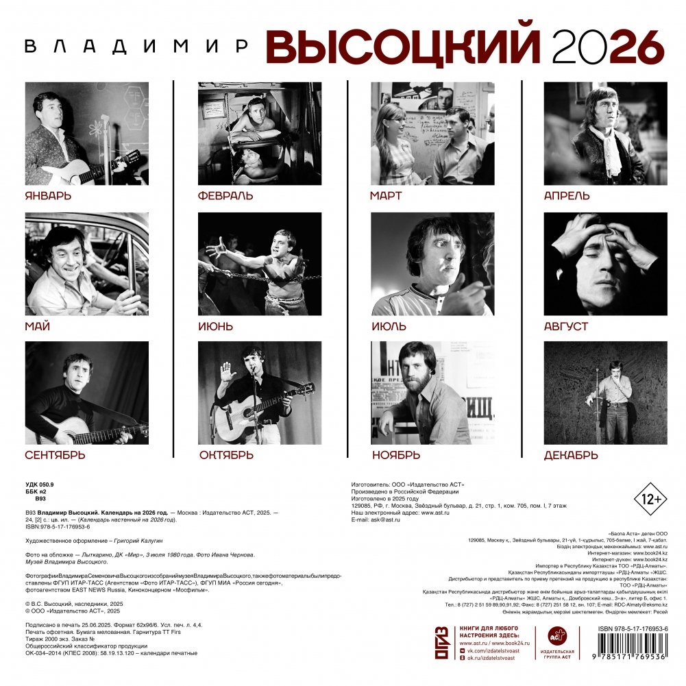 Настенный календарь на 2026 год с эксклюзивными фотографиями легендарного поэта, актера театра и кино, автора-исполнителя песен Владимира Семеновича Высоцкого.