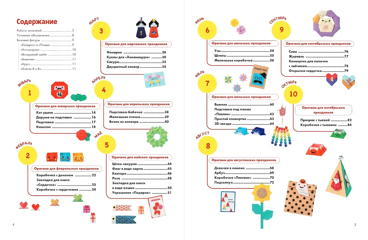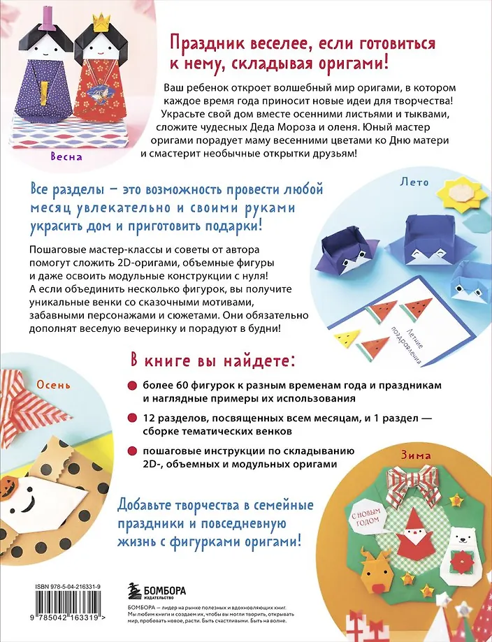 Ваш ребенок откроет волшебный мир оригами, в котором каждое время года приносит новые идеи для творчества! Благодаря этой книге вы сложите из бумаги удивительные декорации и подарки, которые будут радовать каждый день. Все разделы посвящены 12 месяцам, каждый из которых добавит яркости семейным праздникам и поможет провести их весело, складывая оригами. Вы найдете пошаговые инструкции по складыванию более 60 фигурок и советы от автора по их использованию. С подробными мастер-классами ваш ребенок научится складывать как простые 2D оригами, так и объемные и даже модульные фигуры. А если объединить несколько фигурок, вы получите уникальные венки со сказочными мотивами, забавными персонажами и сюжетами. Они обязательно дополнят веселую вечеринку и порадуют в будни!