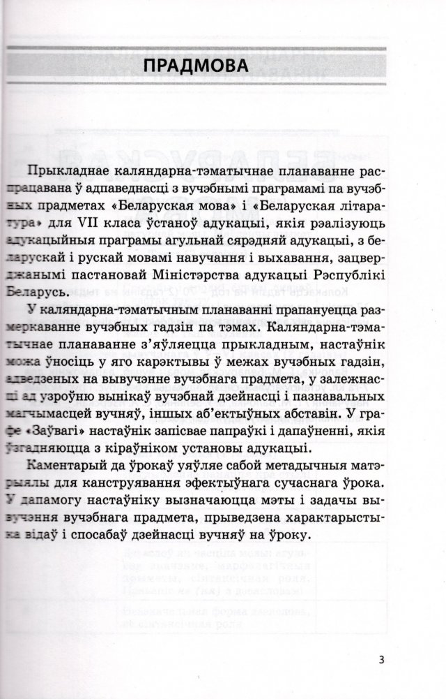 Прыкладнае каляндарна-тэматычнае планаванне распрацавана ў адпаведнасці з вучэбнымі праграмамі па вучэбных прадметах "Беларуская мова" і "Беларуская літаратура" для VII класа ўстаноў адукацыі, якія рэалізуюць адукацыйныя праграмы агульнай сярэдняй адукацыі, з беларускай і рускай мовамі навучання і выхавання, зацверджанымі пастановай Міністэрства адукацыі Рэспублікі Беларусь.
