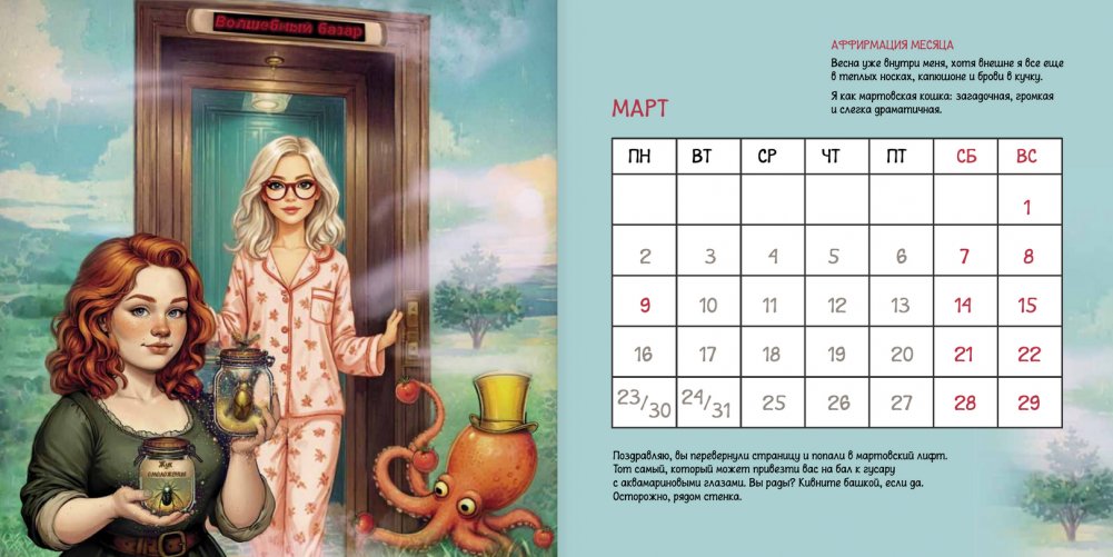 Вдохновение, приди! Вдохновение, приди!.. В пробке где-то стоит, наверное, нет его и нет. А вместе с ним нет и желания что-то делать. Но тут вдруг: "Шур-шур-шур!" Это ты открыл волшебный календарь на 2026 год от автора бестселлеров Зои Арефьевой. Чудесатый мир на иллюстрациях каждый день будет напоминать: волшебство совсем рядом, нужно только верить в него. Даже если мы не видим, Муроздание заботится о нас. Поэтому просто мечтай! В этом помогут авторские аффирмации и послания, написанные специально для этих календарей. Готов отпустить тревогу из-за проблем, почувствовать себя беззаботным ребенком и глотнуть свежего воздуха, чтобы дальше жить эту жизнь? Тогда скорее открывай календарь!