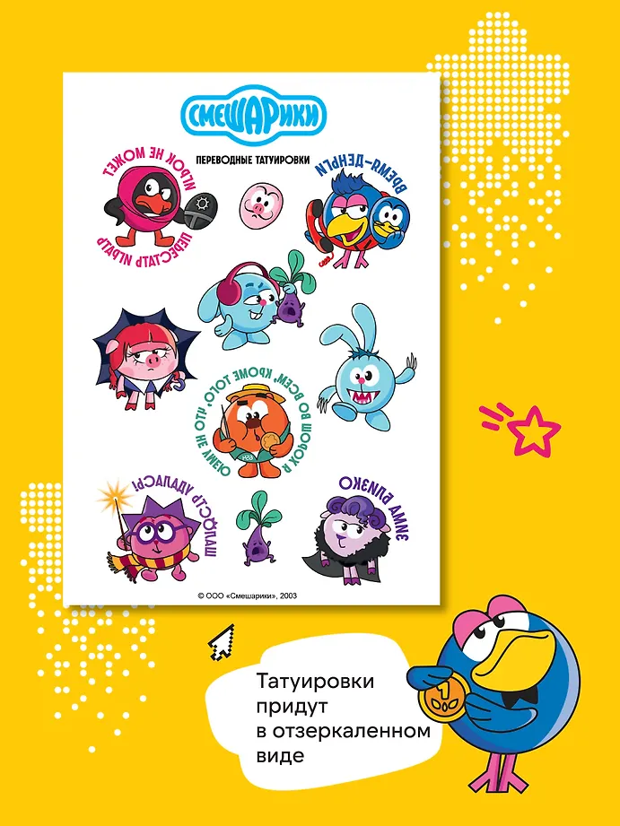 Шалость удалась! Побалуй своего внутреннего ребенка! Специально для этого Смешарики примерили на себя новые образы. Задай себе стиль с помощью переводных татуировок.