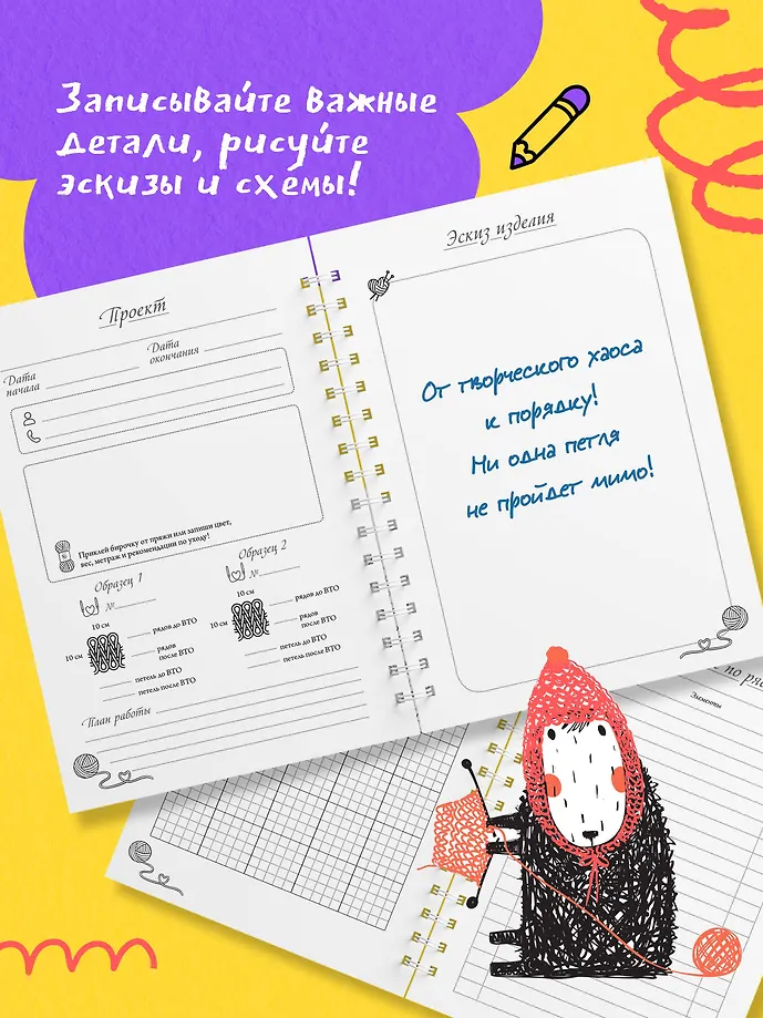 Этот блокнот станет отличным спутником для всех, кто вяжет спицами. Он содержит полезные сведения: информацию о видах пряжи, значения символов по уходу за изделиями, таблицу размеров спиц — все это будет у вас под рукой в любой момент. Большая часть блокнота отведена под проекты: здесь удобно записывать важные детали, делать эскизы и схемы, а также вести пошаговые заметки с точным учетом количества петель. С его помощью вы сможете структурировать свои идеи, сохранить вдохновение и сделать процесс вязания более комфортным и организованным.