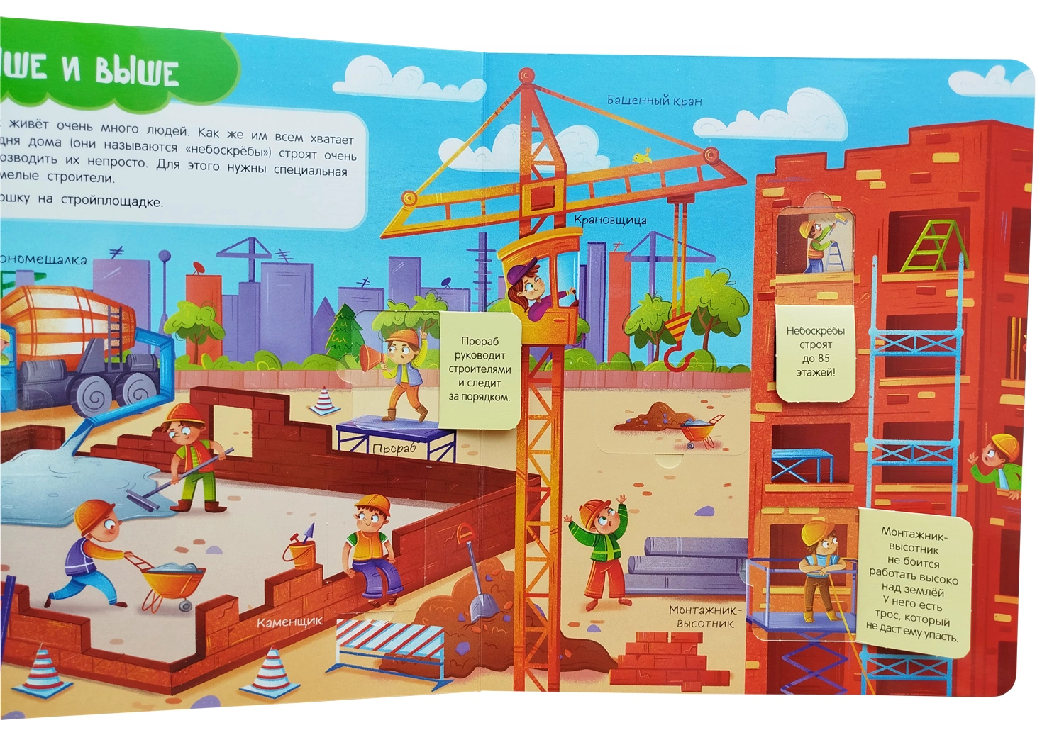 Под множеством окошек-флепов скрываются яркие картинки и дополнительная информация. Дети узнают, как организована работа на стройке, встретятся с рабочими-строителями разных специальностей и познакомятся с умными машинами, строящими дома, дороги и мосты.