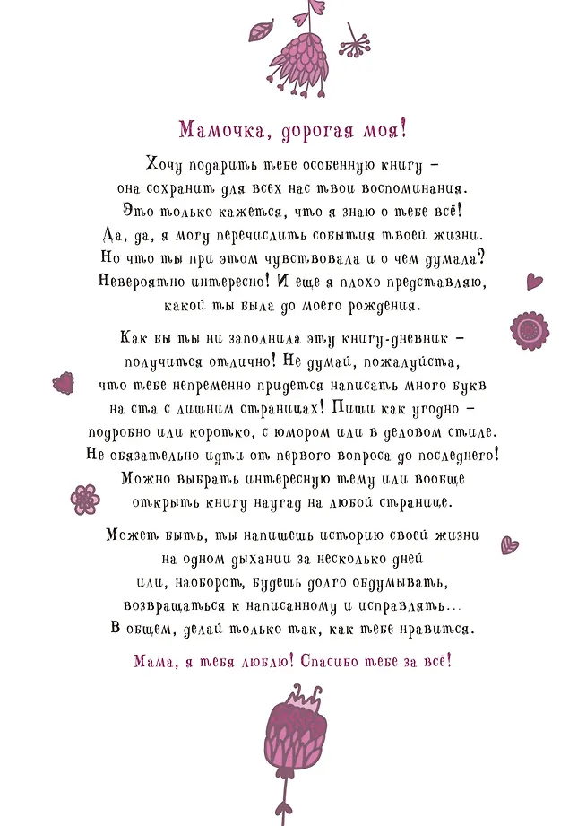 "Мама, расскажи мне… 101 вопрос о тебе и нашей семье" — книга ваших семейных воспоминаний, возможность сохранить память рода. Пусть мамочка почувствует ваш искренний интерес к себе и, ответив на вопросы, оставит вам на память историю своей жизни. Возможно, через много лет именно эта книга станет для ваших потомков семейной реликвией. Для широкой аудитории.