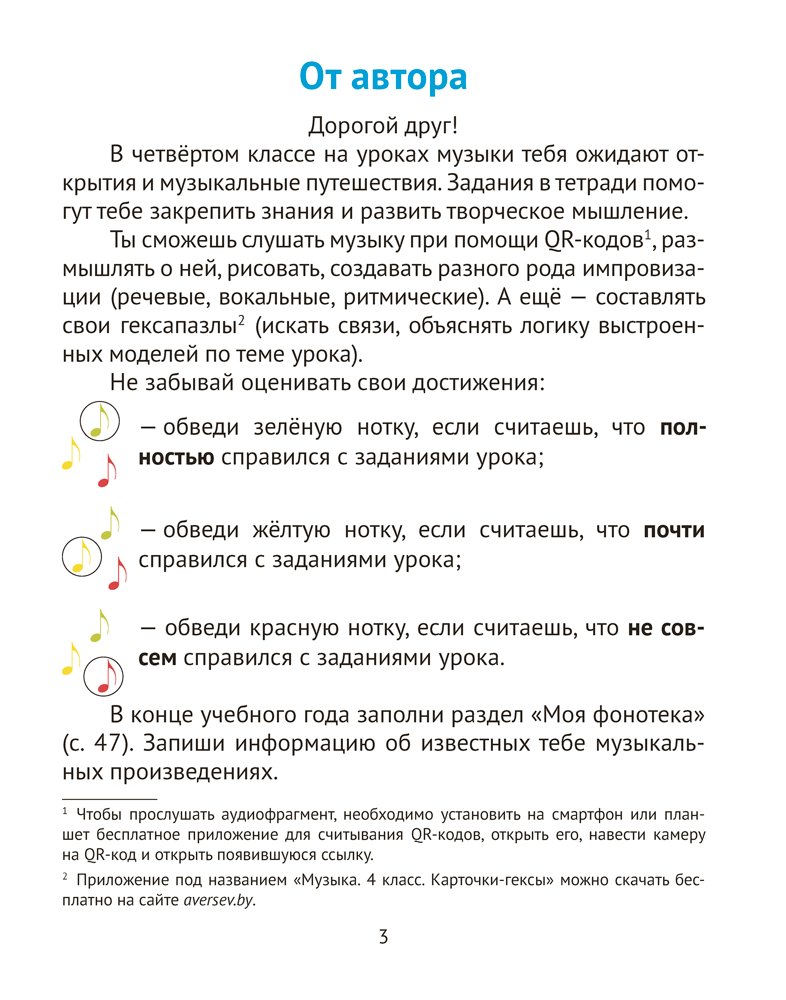 Рабочая тетрадь соответствует учебной программе по музыке и содержит разнообразные задания, направленные на развитие творческих способностей учащихся и формирование интереса к предмету. В пособии размещены QR-коды, с помощью которых четвероклассники смогут послушать фрагменты музыкальных произведений. На каждом уроке предусмотрена система самооценки. При закреплении знаний предлагается использовать гексы, доступные для бесплатного скачивания здесь, а также пособие «Музыка. 4 класс. Демонстрационные плакаты».