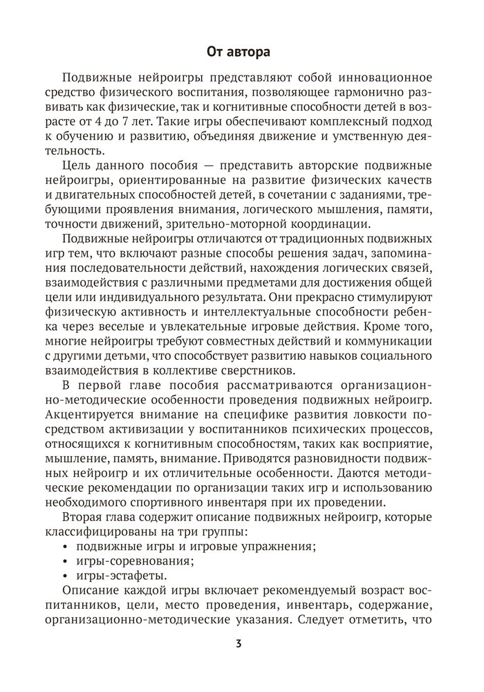 Пособие содержит авторские подвижные нейроигры, ориентированные на развитие физических качеств и двигательных способностей детей от 4 до 7 лет. Игры сопровождаются заданиями, которые требуют проявления внимания, логического мышления, памяти, точности движений, зрительно-моторной координации. Материалы издания способствуют реализации задач образовательной области «Физическая культура» учебной программы дошкольного образования.
