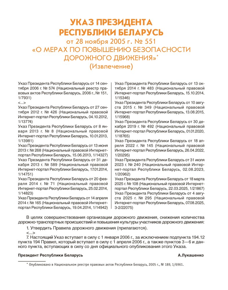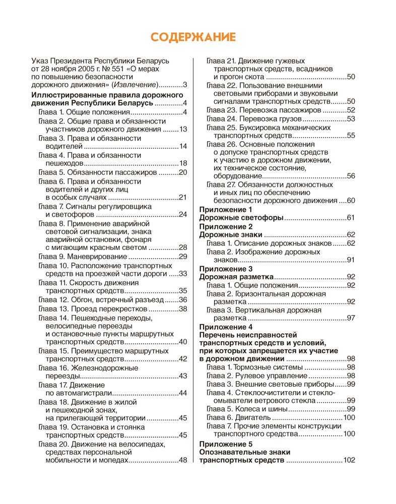 Издание содержит иллюстрированные правила дорожного движения Республики Беларусь, подготовленные на основании Правил дорожного движения, утвержденных Указом Президента Республики Беларусь от 28 ноября 2005 г. № 551 «О мерах по повышению безопасности дорожного движения», с изменениями, внесенными Указом Президента Республики Беларусь от 4 августа 2025 г. № 295 «Об изменении Указа Президента Республики Беларусь» и вступившими в силу 1 сентября 2025 г.