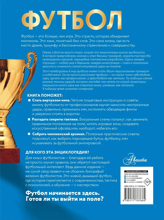 Перед вами книга, целиком посвященная футболу — великой спортивной игре, не оставляющей равнодушными ни детей, ни взрослых. Ее первейшая задача — объяснить во всех подробностях и донести до каждого юного читателя философию и дух самой популярной игры на планете. Это издание вобрало в себя все, чего современный футбол достиг за свою историю — от его истоков в глубокой древности, появления в России и до наших дней. Теоретическая часть книги охватывает главные аспекты непосредственно самой игры: основные правила и особые нюансы, многие из которых известны лишь профессионалам, базовые тактические схемы, виды ударов, способы их нанесения и многое-многое другое. И что важно: эти правила объясняются на конкретных событиях из истории, например: почему "золотой гол" канул в Лету, как работало правило выездного гола и почему вбрасывание из аута может быть опаснее углового. Технические разделы — кладезь практических советов начинающим футболистам: они узнают, как наносить крученый и другие виды ударов, принимать мяч грудью, исполнять "финт Кройфа" или "марсельскую рулетку", выбирать позицию на поле, чеканить мяч, читать сигналы арбитра. Книга наполнена практическими советами и подсказками юному игроку, объясняет сложные футбольные термины. Кроме того, здесь представлена галерея легендарных игроков и тренеров, навсегда оставивших свой след в истории футбола, рассказывается о становлении и пути на вершины пьедесталов величайших футбольных клубов. Не остались без внимания крупнейшие мировые турниры, собирающие миллионы зрителей на футбольных аренах. И все это сопровождается уникальными фотографиями, запечатлевшими лучшие моменты этой фантастической игры. Данная книга не просто дает мальчишкам знания о конкретном виде спорта — она вдохновляет выйти на поле, ведь футбол был и остается красивейшей игрой, которая увлекает и ведет за собой огромное количество последователей и преданных болельщиков. Для среднего и старшего школьного возраста.