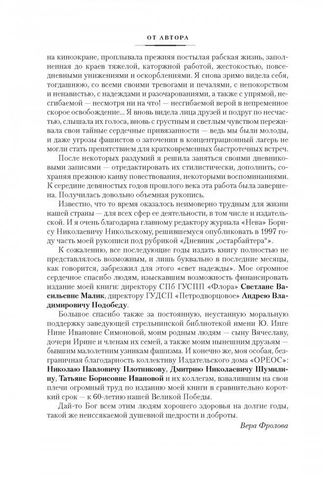«Мне было 17 лет, когда пригород Ленинграда Стрельну, где я родилась и училась в школе, оккупировали немецко-фашистские войска. А весной 1942 года нацисты угнали меня с мамой в Германию, где мы стали „остарбайтерами“, иначе говоря „восточными рабами“...» — писала Вера Павловна в предисловии к первому изданию, предваряя этим сдержанным и лаконичным пересказом мучительно-страшных биографических фактов потрясающий по силе человеческий документ — свидетельство очевидца и участника одной из самых чудовищных трагедий XX века.
