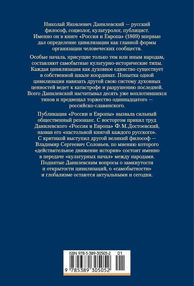 Николай Яковлевич Данилевский — русский философ, социолог, культуролог, публицист. Именно он в книге «Россия и Европа» (1869) впервые дал определение цивилизации как главной формы организации человеческих сообществ. Особые начала, присущие только тем или иным народам, составляют самобытные культурно-исторические типы. Каждая цивилизация как духовное единство существует в собственной шкале координат. Попытка одной цивилизации навязать другой свою систему духовных ценностей ведет к катастрофе и разрушению последней. Всего Данилевский насчитывал десять уже воплотившихся типов и предвещал торжество одиннадцатого — российско-славянского. Публикация «России и Европы» вызвала сильный общественный резонанс. С восторгом принял труд Данилевского «Россия и Европа» Ф. М. Достоевский, назвав его «настольной книгой каждого русского». С критикой выступил другой великий философ — Владимир Сергеевич Соловьев, по мнению которого «действительное движение истории» состоит именно в передаче «культурных начал» между народами. Поднятые Данилевским вопросы о замкнутости и открытости цивилизаций, о «самобытности» и глобализме остаются актуальными и сегодня.