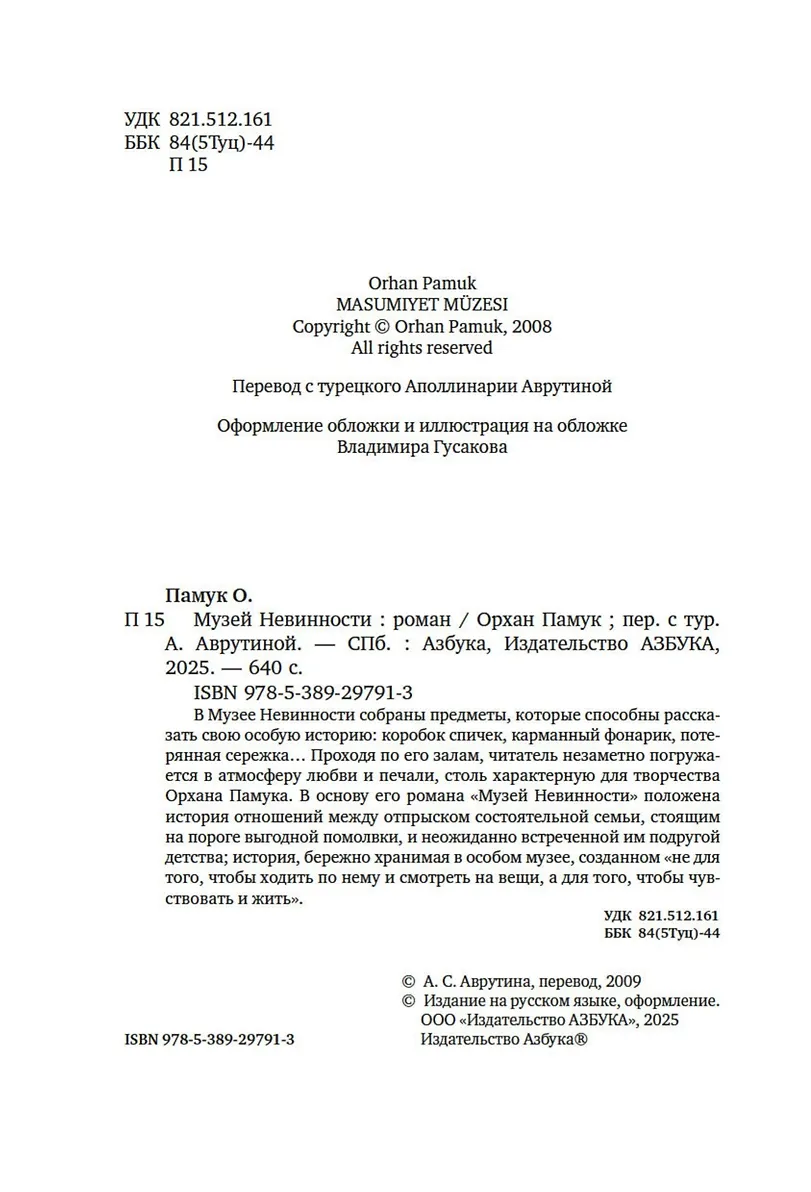 В Музее Невинности собраны предметы, которые способны рассказать свою особую историю: коробок спичек, карманный фонарик, потерянная сережка... Проходя по его залам, читатель незаметно погружается в атмосферу любви и печали, столь характерную для творчества Орхана Памука. В основу его романа «Музей Невинности» положена история отношений между отпрыском состоятельной семьи, стоящим на пороге выгодной помолвки, и неожиданно встреченной им подругой детства; история, бережно хранимая в особом музее, созданном «не для того, чтобы ходить по нему и смотреть на вещи, а для того, чтобы чувствовать и жить».
