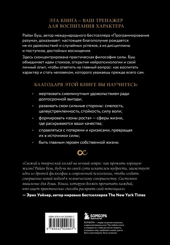В чем источник силы и внутреннего благополучия? Райан Буш, автор мировых бестселлеров, утверждает: все начинается с характера. Опираясь на стоическую философию, современные психологические исследования и собственный опыт, Буш предлагает ясный взгляд на то, как развивать силу воли, стойкость и целеустремленность, учиться преодолевать трудности и формировать внутренний стержень. Эта книга – практическое руководство для тех, кто хочет построить жизнь, достойную восхищения.