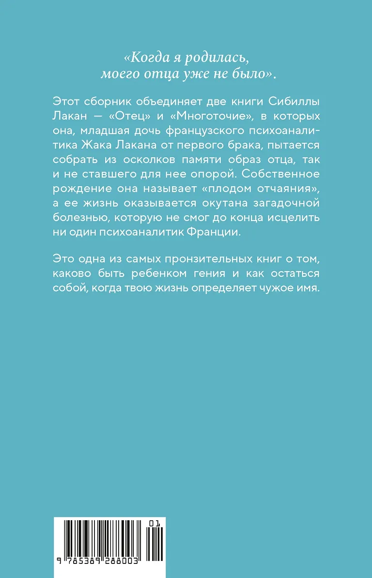 Этот сборник объединяет две книги Сибиллы Лакан — «Отец» и «Многоточие» — в которых она, младшая дочь французского психоаналитика Жака Лакана от первого брака, пытается собрать из осколков памяти образ отца, так и не ставшего для нее опорой. Собственное рождение она называет «плодом отчаяния», а ее жизнь оказывается окутана загадочной болезнью, которую не смог до конца исцелить ни один психоаналитик Франции.